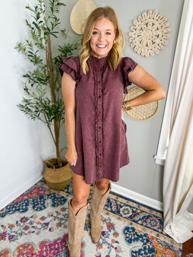 This mineral-washed dress brings effortless charm to your everyday style. A ruffled mock neckline and fluttery layered sleeves add a feminine touch...