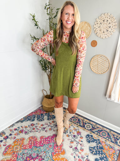 A fresh twist on a classic favorite, this green suede overall mini dress blends casual charm with a luxe feel. Designed with a sleek, streamlined s...