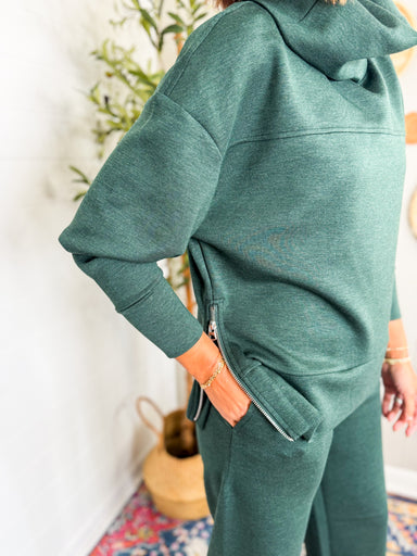 Cozy meets cool in this playful sweater set featuring a mock neck short sleeve top with flattering side shirring and comfy long pants. The top’s re...