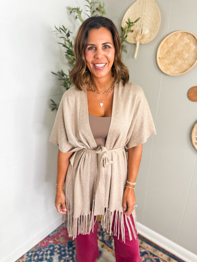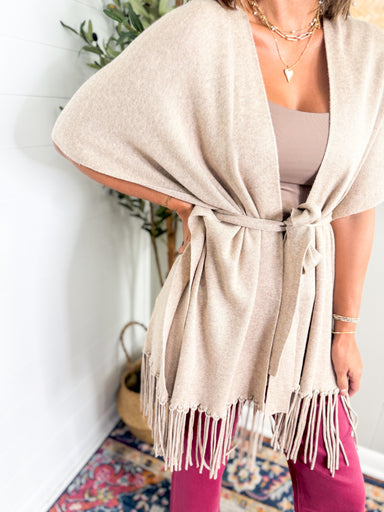 Effortless style meets cozy comfort with this Fringe Trimmed Poncho. Crafted from a soft, drapey fabric, it features delicate fringe detailing alo...