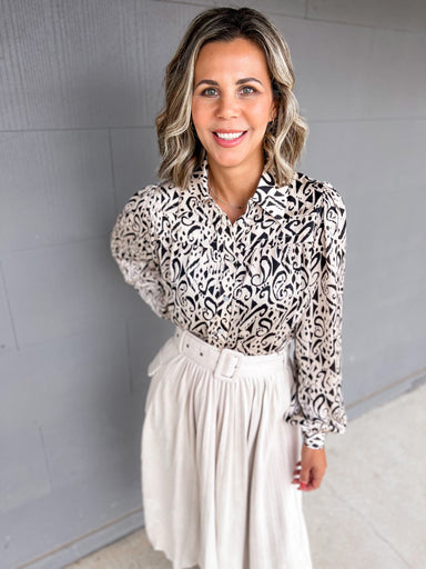 Bring a touch of bold sophistication to your look with this brown python print blouse. Designed with a button-front closure and classic collar, it...