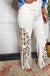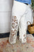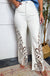 The Bayeas Beige High Rise Lace Wide Leg Jean features a flattering high rise and wide leg silhouette with delicate lace detailing.