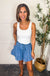 Chevron down icon Chevron down icon Zoom icon Click to expand Tap to zoom Denim Drawstring Ruffle Tiered Shorts On Sale $66.95 | / Small - $66.95 Medium - $66.95 Large - $66.95 Size Small Medium Large 1 2 3 4 5 6 7 8 9 10+ Quantity Chevron down icon Quantity Add to cart Spinner icon This item is a recurring or deferred purchase. By continuing, I agree to the cancellation policy and authorize you to charge my payment method at the prices, frequency and dates listed on this page until my order is fulfilled or I cancel, if permitted. noun-checkmark-circle-1939611 In stock noun-shop-4255622 Store pickup available Notify me when back in stock Email address Email me when available Fit: True to size Small: Fits sizes 2-4 Medium: Fits sizes 6-8 Large: Fits sizes 10-12 Model Specs: Cindy: 5'6", wearing a size Small. Maggie: 5’10”, wearing a size Large. (21 weeks pregnant)