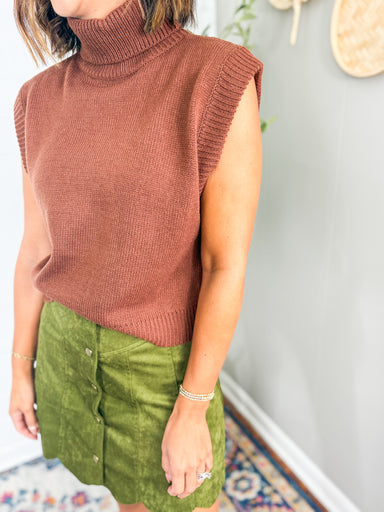 A modern essential with timeless charm, this camel turtleneck sweater vest brings effortless sophistication to any outfit. The cropped silhouette a...