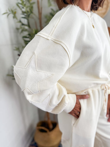 Elevate your casual wardrobe with this cozy crewneck sweatshirt, accented by playful star patches along the sleeves. The relaxed fit makes it an ea...
