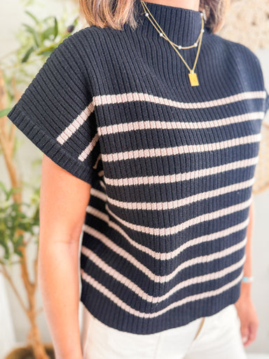 Add a touch of sophistication and style to your wardrobe with our Stripe Mock Neck Short Sleeve Knit Sweater. Crafted with premium quality material...
