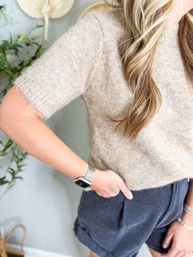 Sweet, simple, and so easy to wear! This lightweight mocha knit is the perfect go-to for any season. With its cozy texture and breezy short sleeves...